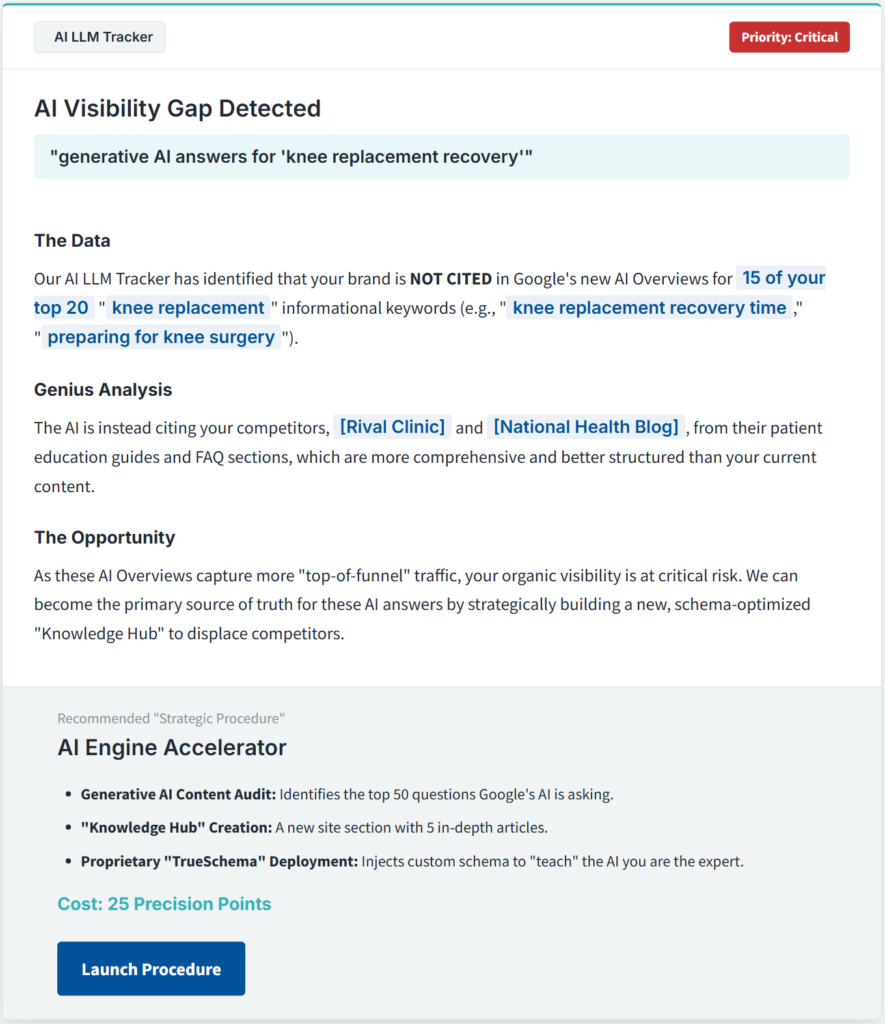 We build a proprietary AI model for each client using data from your competitors, your rankings, and your market conditions. The output is a prescriptive blueprint: the right actions, in the right order, with the data to back every one.