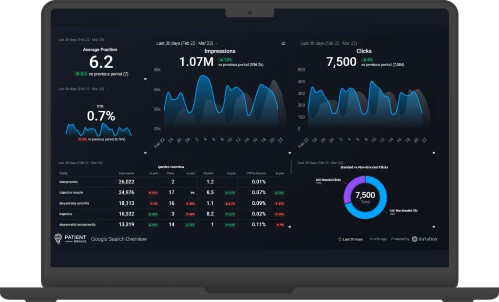 Not every search means the same thing. “What is knee replacement recovery like” is research. “Knee replacement surgeon near me” is ready to book. Your model classifies the intent behind every keyword so your content meets patients at the right stage.